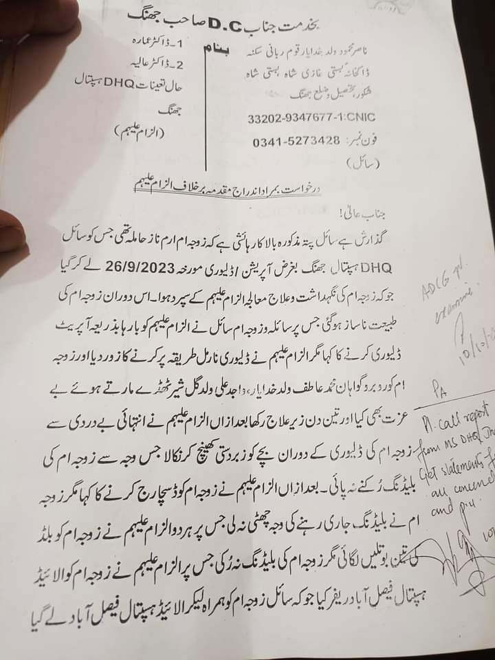 ڈپٹی کمشنر جھنگ نے شہری کی درخواست پر ڈی ایچ کیو جھنگ گائنی کی دو لیڈی ڈاکٹرز کے خلاف اے ڈی سی جی جھنگ کو انکوائری کا حکم دے دیا