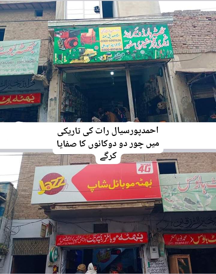 احمدپورسیال مین روڈ نزد درس جامعتہ الغدیر 2 دوکانوں پر رات کی تاریکی میں چوری کی واردات