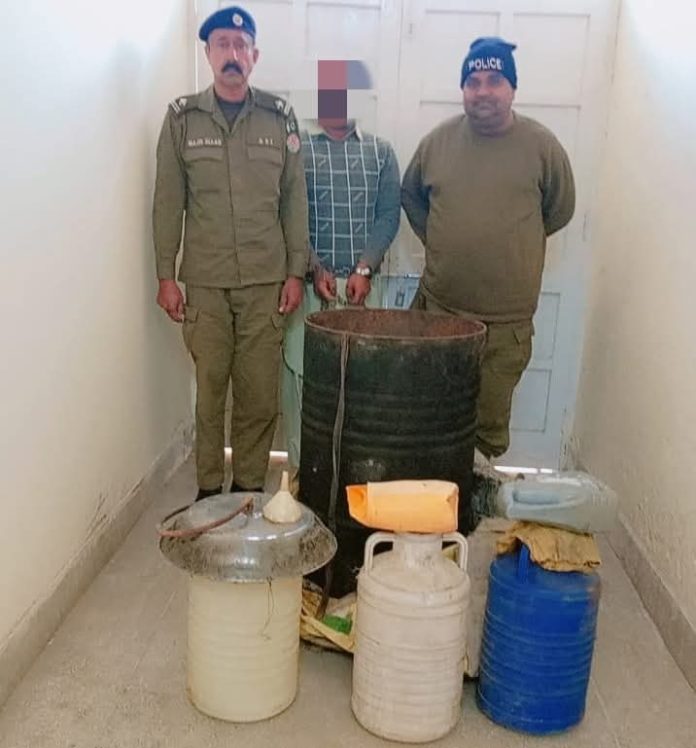 گرفتار منشيات فروش شعیب سے دیسی شراب 90 لٹر برآمد