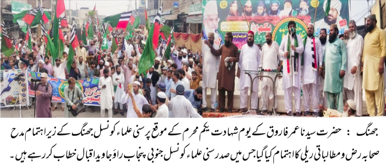 جھنگ ( علی رحمن سے ) خلیفہ دوم ، مراد قلب رسول ص، حضرت سیدنا عمر فاروق رض کے یوم شہادت یکم محرم الحرام کے موقع پر سنی علماء کونسل جھنگ کے زیر اہتمام مدح صحابہ رض و مطالباتی ریلی کا اہتمام کیا گیا جس میں خصوصی طور پر صدر سنی علماء کونسل جنوبی پنجاب راؤ جاوید اقبال نے شرکت کی اور ریلی کی قیادت کی جس میں سینکڑوں افراد نے شرکت کی ۔ اس موقع پر صدر سنی علماء کونسل تحصیل جھنگ مولانا عزیز اللہ جھنگوی ، قاری ممتاز فاروقی صدر تحصیل احمد پورسیال، قاری رفیق حیدری جنرل سیکرٹری سنی علماء کونسل جھنگ ، صدر پاکستان راہ حق پارٹی جھنگ رانا شوکت علی ، خلیل احمد منصوری ، حاجی رمضان جانا ۔ شیخ حاکم علی سابق صوبائی وزیر ، اکرم قریشی ، علی رحمان انصاری فنانس سیکرٹری پاکستان راہ حق پارٹی پنجاب نے شرکت کی ۔ ملہوانہ موڑ سے شروع ہونے والی مختلف راستوں سے ہوتی ہوئی ایوب چوک اختتام پزیر ہوئی جہاں شرکاء سے خطاب کرتے ہوئے صدر سنی علماء کونسل جنوبی پنجاب راؤ جاوید اقبال اور صدر سنی علماء کونسل جھنگ حافظ خالد جھنگوی سمیت دیگر قائدین و علماء کرام کا کہنا تھا کہ سیدنا فاروق اعظم رض کے یوم شہادت کو سرکاری سطح پر منایا جائے ۔ سیدنا فاروق اعظم رض کے یوم شہادت پر یکم محرم الحرام کو کے پی کے میں سرکاری چھٹی کرنے پر حکومت کو مبارکباد پیش کرتے ہیں۔ پنجاب ، سندھ اور بلوچستان میں بھی یوم شہادت عمر پر چھٹی کا اعلان کیا جائے۔ آپ ﷺ نے ارشاد فرمایا کہ ” لو كان بعدي نبي لكان عمر بن الخطاب ” (سنن الترمذي: 3686) ترجمہ: ” اگر میرے بعد کوئی نبی ہوتا تو وہ عمر بن خطاب ہوتا ” ۔